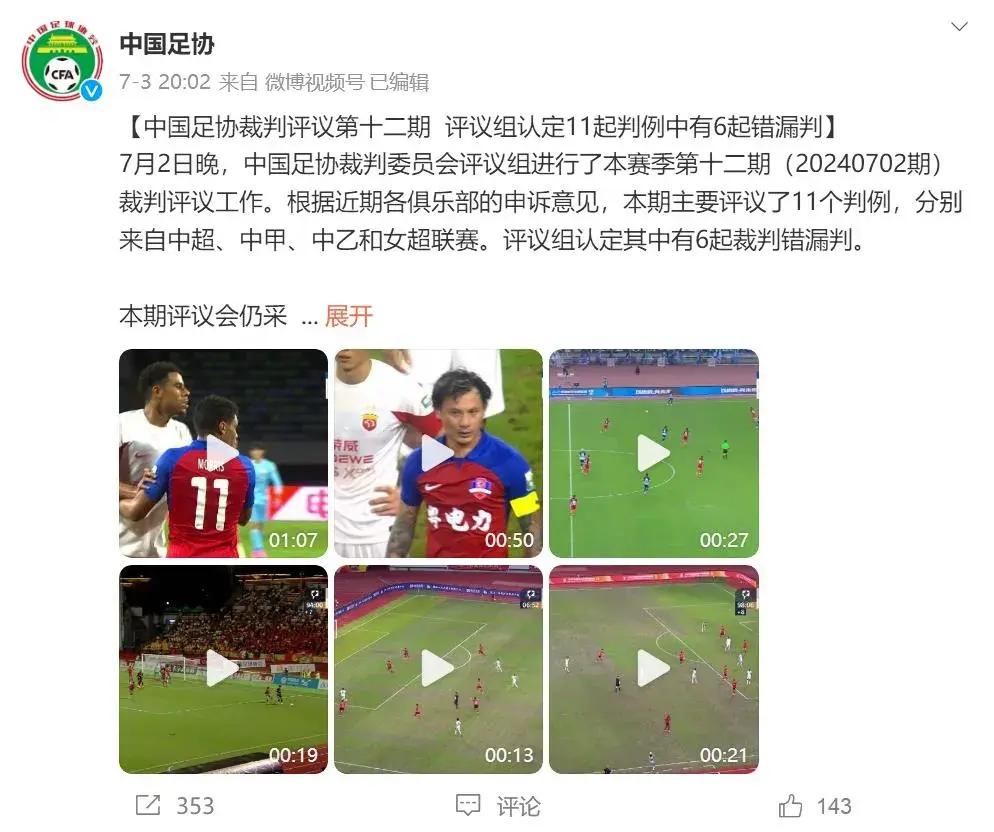 足協在2022賽季推出了裁判評議制度,但2024賽季,全面的公開評議制度無疑是一次巨大的變革和進步。截至本賽季,足協發佈了26期裁判評議,總計161個案例,其中裁判有錯的案例56個,佔比超過1/3。此外,還有幾例雖然結果無誤,但VAR介入程序錯誤或存在其他問題。
