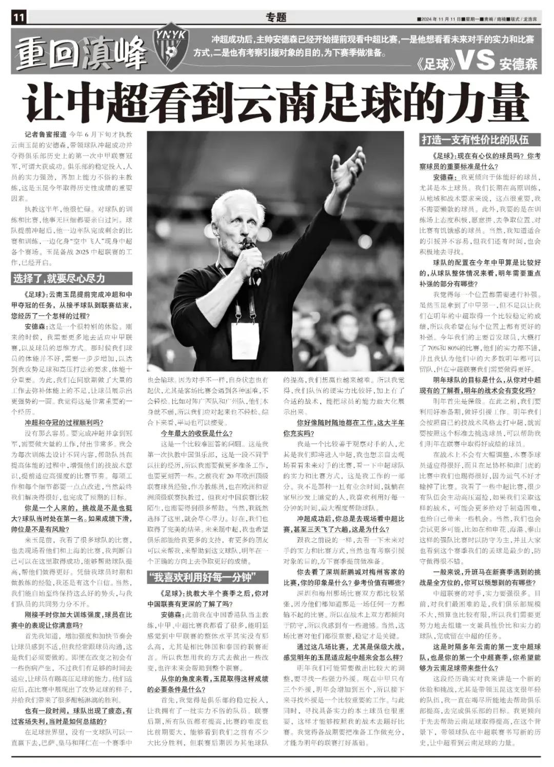 這段經歷確實對我來講是一個新的體驗和挑戰,尤其是帶領玉昆這支很年輕的隊伍,我一直在竭盡所能地去幫助俱樂部提高,去完成俱樂部的目標。我更傾向於先去幫助雲南足球取得提高,在這個背景下,帶領球隊在中超聯賽書寫新的歷史,讓中超看到雲南足球的力量。