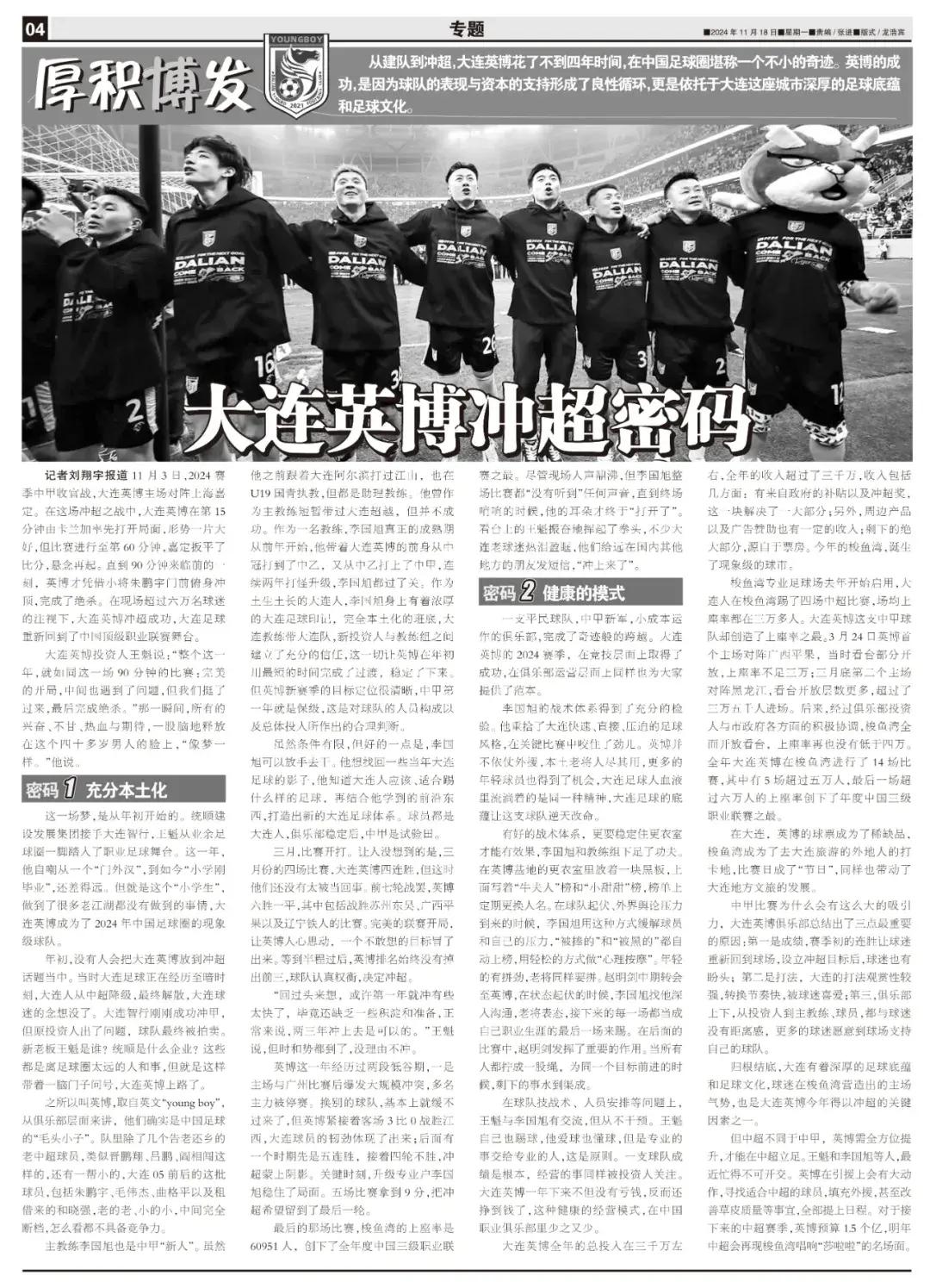 一支平民球隊,中甲新軍,小成本運作的俱樂部,完成了奇蹟般的跨越。大連英博的2024賽季,在競技層面上取得了成功,在俱樂部運營層面上同樣也爲大家提供了範本。