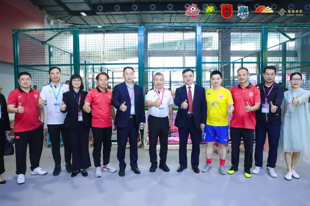 當天中午,“我愛足球,穗安街超三人足球系列挑戰賽”體博會站的賽事在廣交會展館B區11.1號館打響,趙利紅、譚恩德、朱偉卓、黃國才、歐偉庭等足球名宿披掛上陣。廣東省體育局局長崔劍來到場邊觀看比賽,廣東省足協副主席周穗安在現場向大家介紹了賽事理念。