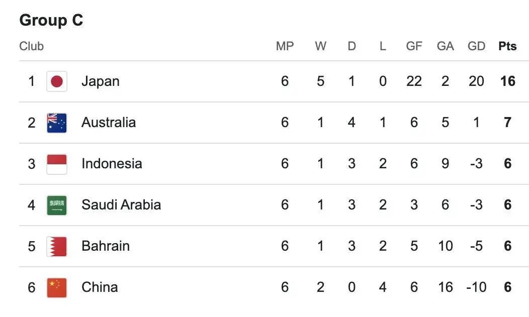 記者寒冰報道 國足主場1比3不敵日本,印尼主場2比0爆冷擊敗沙特,巴林主場再次補時失球被澳大利亞絕平,18強賽第6輪戰罷,C組出線形勢更加膠着。日本隊積16分一騎絕塵,第2名澳大利亞也僅積7分,印尼、沙特阿拉伯、巴林和中國同積6分。遙遙領先的日本隊只需明年3月主場擊敗巴林,即可基本提前鎖定出線。其餘5支球隊未來4場比賽任何結果,都將決定另1個直接出線名額和2個附加賽名額歸屬。