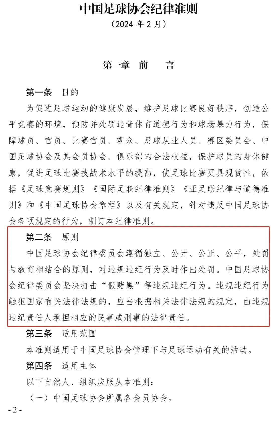 《中國足球協會紀律準則》(2024年版)第二條“原則”中有這樣的文字:中國足球協會紀律委員會遵循獨立、公開、公正、公平,處罰與教育相結合的原則,對違規違紀行爲及時作出處罰。中國足球協會紀律委員會堅決打擊“假賭黑”等違規違紀行爲。違規違紀行爲觸犯國家有關法律法規的,應當根據相關法律法規的規定,由違規違紀責任人承擔相應的民事或刑事的法律責任。