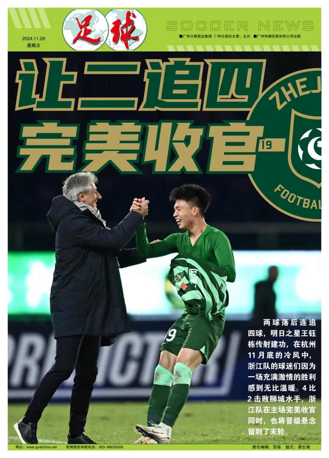 特約記者徐毅報道 “大逆轉!王鈺棟還收穫職業賽事首球!!!今年的主場收官戰完美了。”4比2擊敗新加坡獅城水手後,一名浙江FC高層笑着說。在杭州11月底的冷風中,浙江隊的球迷們因爲一場充滿激情的勝利感到無比溫暖。