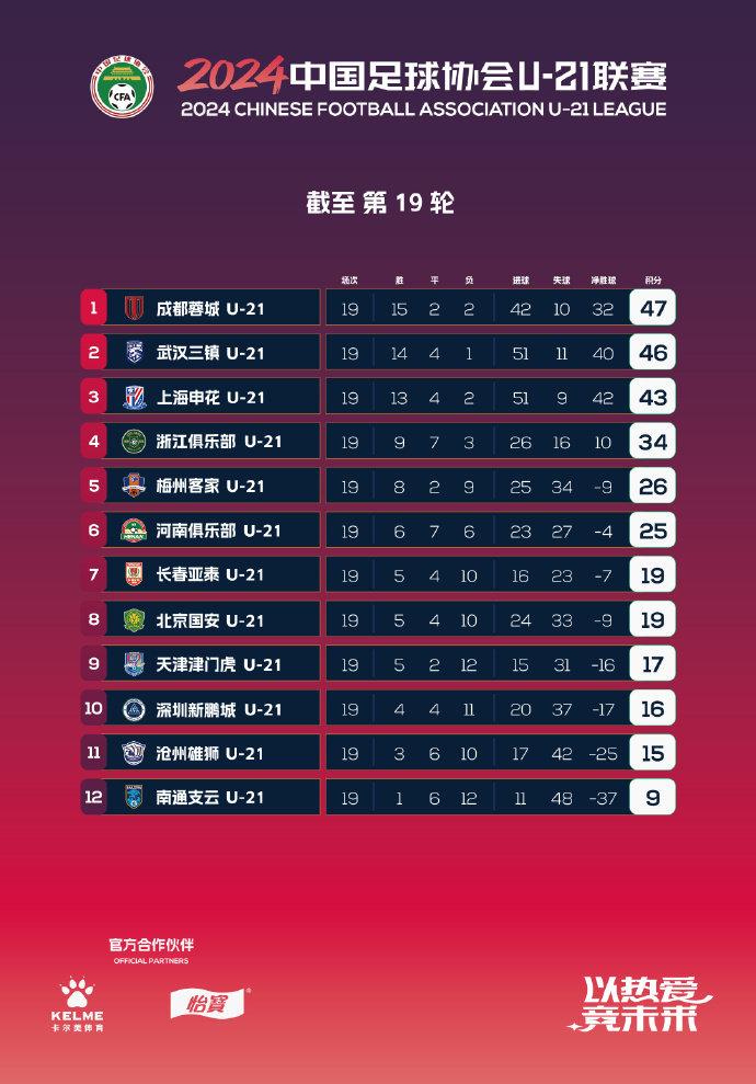2024賽季的U21聯賽目前進入到最後一個階段,也就是最後三輪比賽。前19輪戰罷,U21聯賽積分榜上出現了明顯的分化,三強球隊成都蓉城、武漢三鎮和上海申花積分優勢明顯,三隊的積分分別是成都蓉城47分、武漢三鎮46分,以及上海申花43分。不過,2025賽季的中乙只有兩個U21名額,三隊仍要展開殘酷的競爭。