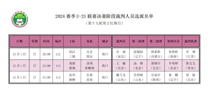值得注意的是,本次U21聯賽中,部分中超裁判甚至國際級裁判馳援賽區:浙江和天津津門虎的比賽,主裁判是國際級裁判沈寅豪;上海申花和南通支雲的比賽,主裁判是顧春含;河南和梅州客家的比賽,主裁判是國際級裁判金京元;武漢三鎮和北京國安的比賽,主裁判是任通;成都蓉城和深圳新鵬城的比賽,主裁判是王巍;滄州雄獅和長春亞泰的比賽,主裁判是戴弋戈。其中部分中超裁判將完成整個U21聯賽最後階段的執法。