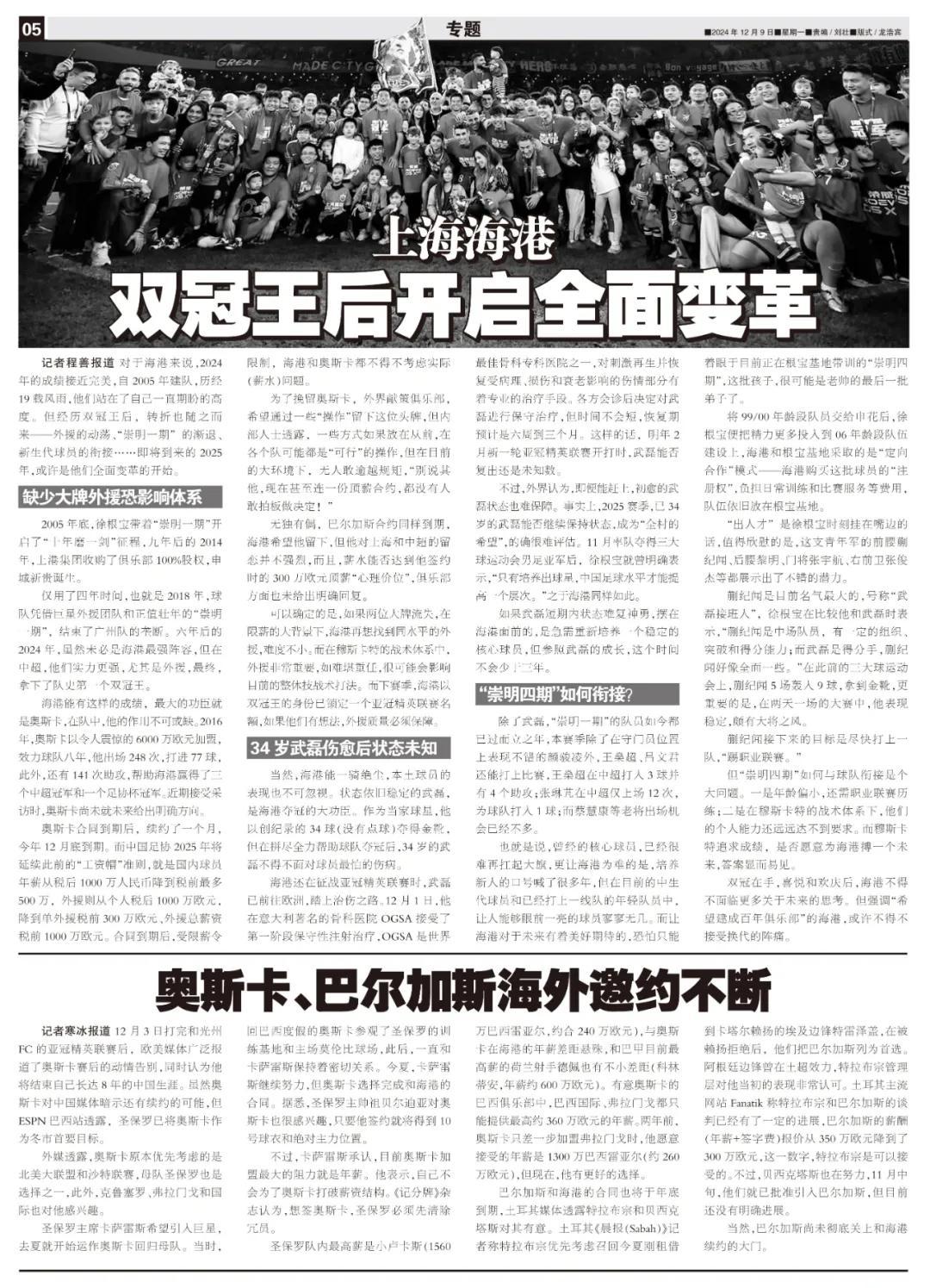 記者程善報道 對於海港來說,2024年的成績接近完美,自2005年建隊,歷經19載風雨,他們站在了自己一直期盼的高度。但經歷雙冠王后,轉折也隨之而來——外援的動盪、“崇明一期”的漸退、新生代球員的銜接……即將到來的2025年,或許是他們全面變革的開始。