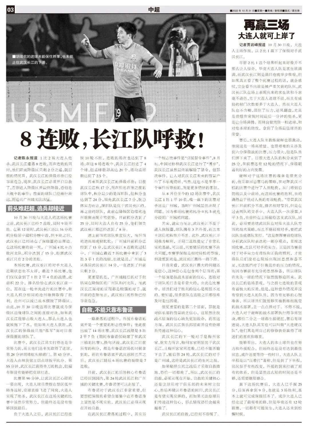 輸給大連人之後,武漢長江已經連續10輪不勝,連敗的場次也達到了8場,在這8場連敗中,武漢長江打進了4個球,但丟球數卻高達20個,場均丟球數達到了2.5個。