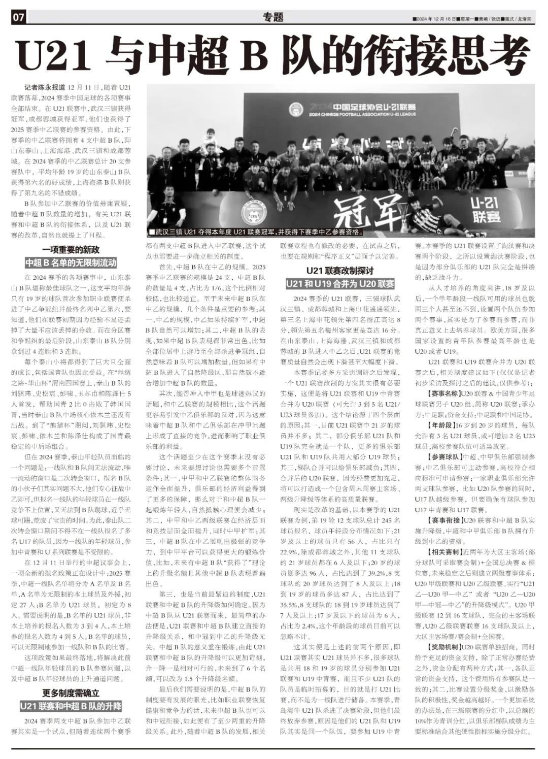 B隊參加中乙聯賽的價值毋庸置疑,隨着中超B隊數量的增加,有關U21聯賽和中超B隊的銜接體系,以及U21聯賽的改革,自然也就提上了日程。