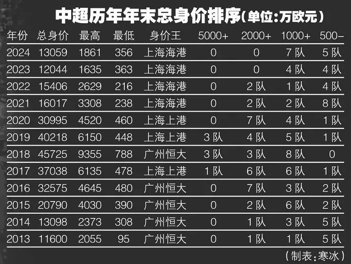但這樣的“燒錢競賽”終究不可持續,2019年開始中超總身價就開始持續下降,短短4年就從2018賽季末的4.57億歐元降到2021年的1.6億,總身價“蒸發”了65%。2021年至今,中超總身價一直在1億歐元區間下降,直到今年終於止跌反彈。2019年以來,中超賽季末身價王一直是上海上港/海港,但也是同步下降,從6150萬歐元(2019年)降到1635萬歐元(2023年)的最低谷,同樣縮水了3/4。