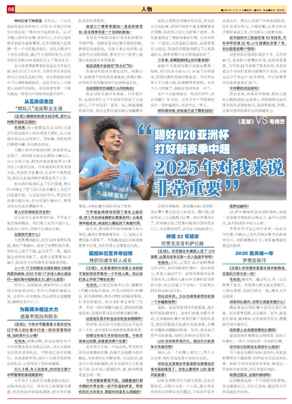 當下就是先踢好U20亞洲盃,再就是新賽季的中超聯賽,明年還有全運會的比賽。2025年對我來說非常重要,希望這一年我有好的發揮,然後再想其他的。