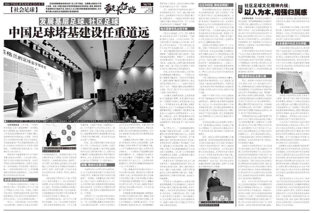 結合堪稱中國足球年度最高端會議的本次會議,《足球》報也最終發佈了這一期的《2024中國足球發展研討會白皮書》,在足協發展理念、全國足球發展重點城市推進、職業聯賽建設和社會足球普及等四個層面進行了全面的解讀,青少年足球的相關內容則深度融入。一次會議當然無法爲中國足球提供終極解決方案,但碰撞了思維、統一了思想、打破了壁壘、激發了情懷,卻是這次會議帶給我們最實實在在的感受。