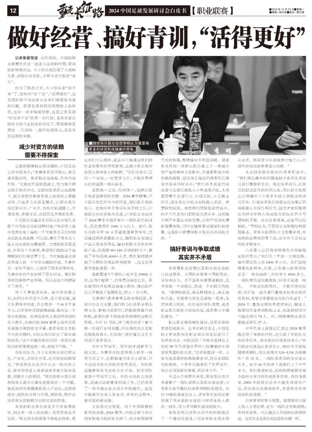 北京國安俱樂部總經理李明表示:“我們現在最大的問題是缺少更多優秀球員進行健康的競爭。現在很多球員,在自己的舒適區待的時間太長,所以俱樂部要在合理情況下有更多年輕人來跟這些球員競爭。但是很多俱樂部確實在決策層面和投資人方面有些壓力,因爲大家好像都認爲培養年輕人和成績方面存在着不可調和的矛盾。其實在我看來,這是可以控制的。”李明認爲,只要俱樂部加強結構管理體系,用專業的團隊大力發展青訓,有良性的運營和經營手段,其實並不會有這樣的矛盾發生。