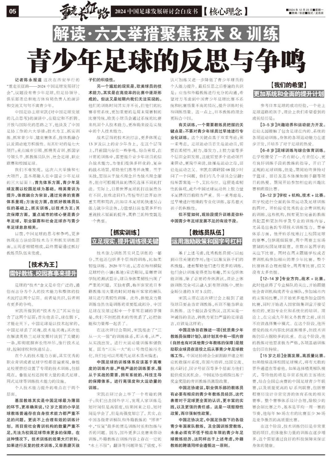 我們不難發現,這次六大舉措和七大項目,基本都融入在中國青少年足球的三大層面上:首先體系方面,青少年足球發展以校園足球爲基礎,精英青訓爲提升,體教融合爲宗旨,通過完善的競賽體系呈現;方法論方面,在抓好教練員隊伍的基礎上,抓實訓練,以技術爲王;其次保障方面,重點城市的核心便是青少年足球,職業聯賽和社會足球亦與青少年足球息息相關。