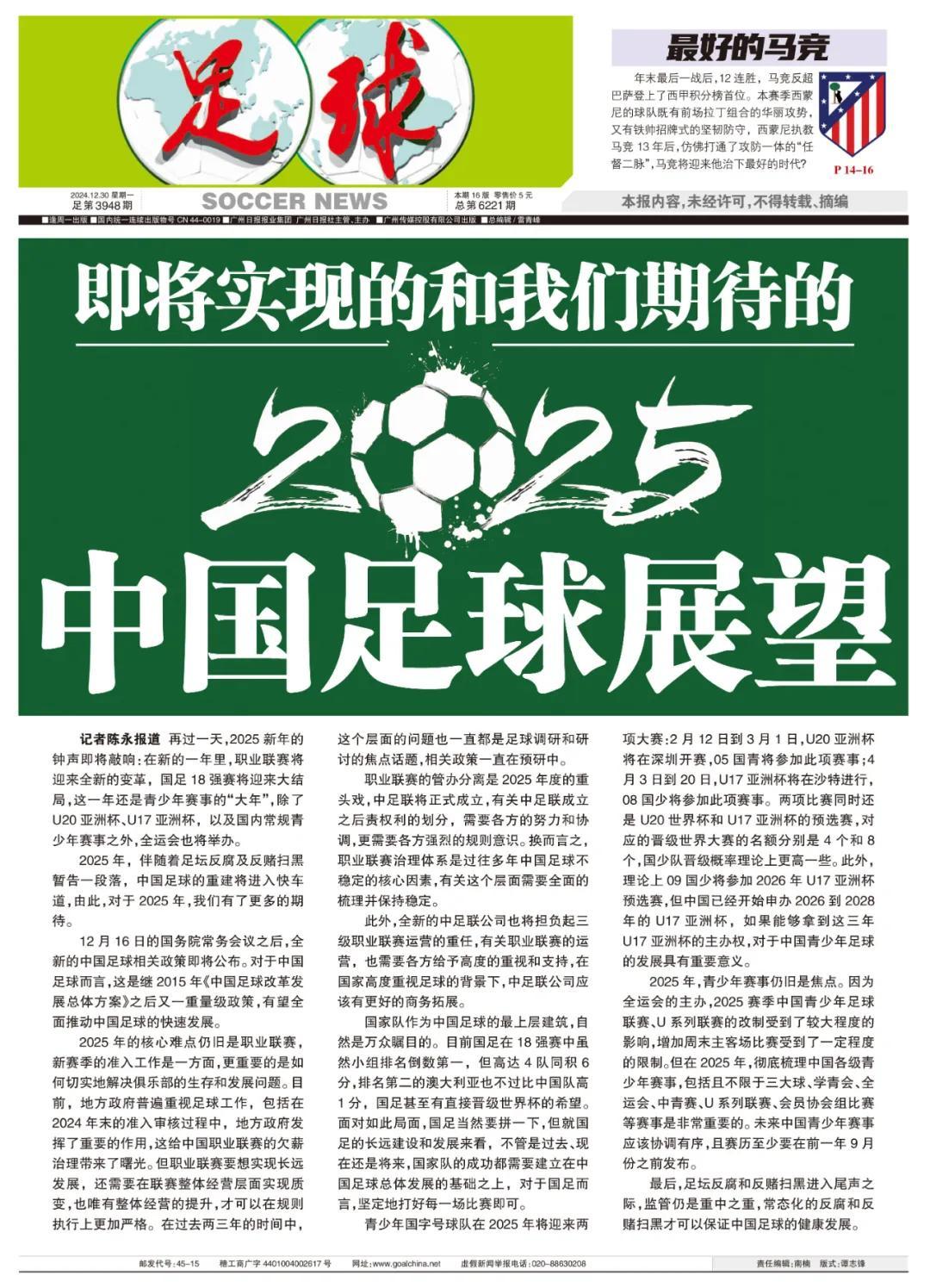 記者陳永報道 再過一天,2025新年的鐘聲即將敲響:在新的一年裏,職業聯賽將迎來全新的變革,國足18強賽將迎來大結局,這一年還是青少年賽事的“大年”,除了U20亞洲盃、U17亞洲盃,以及國內常規青少年賽事之外,全運會也將舉辦。伴隨着足壇反腐及反賭掃黑暫告一段落,中國足球的重建將進入快車道,由此,對於2025年,我們有了更多的期待。