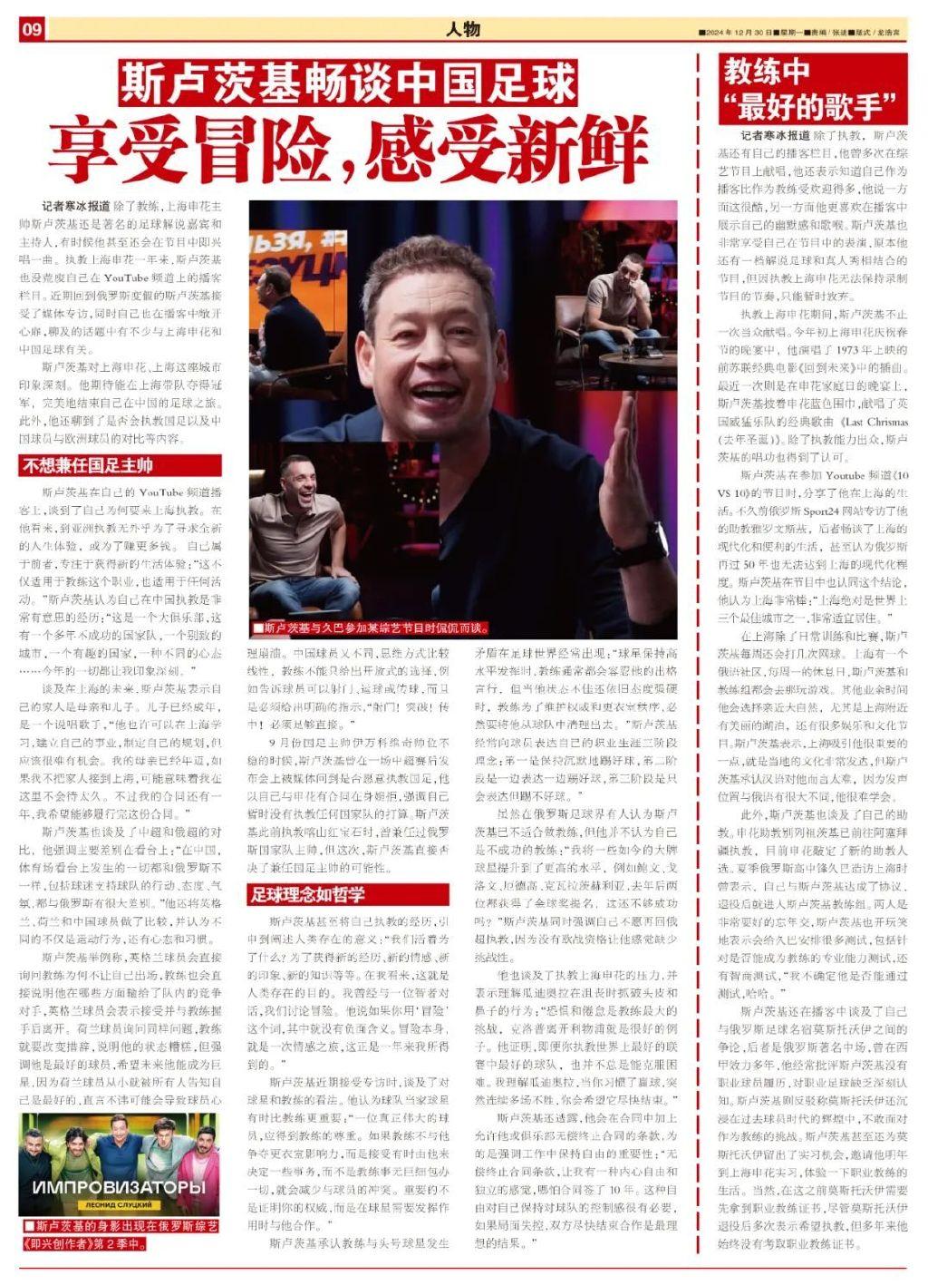 記者寒冰報道 除了教練,上海申花主帥斯盧茨基還是著名的足球解說嘉賓和主持人,有時候他甚至還會在節目中即興唱一曲。執教上海申花一年來,斯盧茨基也沒荒廢自己在YouTube頻道上的播客欄目。近期回到俄羅斯度假的斯盧茨基接受了媒體專訪,同時自己也在播客中敞開心扉,聊及的話題中有不少與上海申花和中國足球有關。