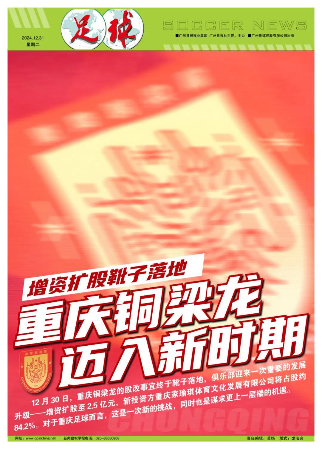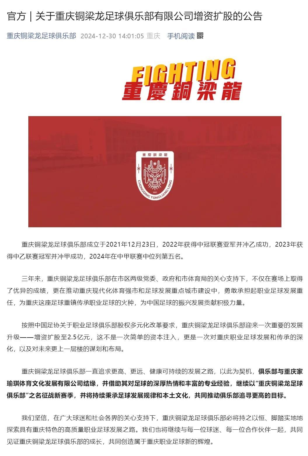 記者魯蜜報道 12月30日,重慶銅梁龍的股改事宜終於靴子落地,俱樂部迎來一次重要的發展升級——增資擴股至2.5億元,新投資方重慶家瑜琪體育文化發展有限公司將佔股約84.2%,這是一家2024年剛成立的體育公司,對外投資只有重慶銅梁龍足球俱樂部。銅梁龍此前的主體是國資控股的企業,在衆多職業俱樂部因爲經營原因而求助政府、國企資金支持的洪流之下,銅梁龍俱樂部按《中國足球發展改革總體方案》進行股權多元化嘗試,這對於重慶足球來講,是一次新的挑戰,同時也是謀求更上一層樓的機遇。