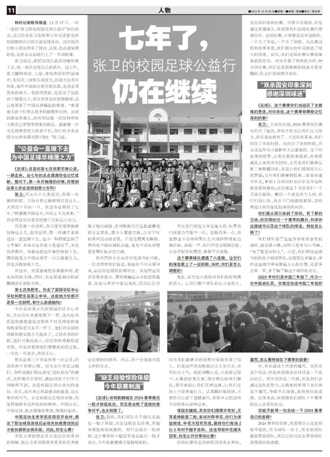 張衛說過,要把這項公益活動繼續做下去,他一直在兌現自己的諾言。這七年,張衛輾轉南京、上海,青島和深圳四座城市,先後在三傢俱樂部效力,但是無論身在何處,每年年底的合肥市肥東縣,是他必須要來的地方。他最欣慰的,是見證了這批孩子慢慢長大,而且很多還在堅持踢球,這讓他看到了中國足球崛起的希望。