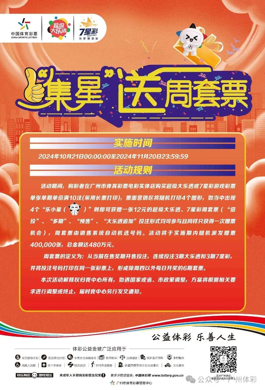2024年,在確保安全運行的前提下,廣州體彩以中國體育彩票全國統一發行30年爲契機,共銷售體育彩票84.13億元,籌集公益金19.49億元,其中市本級公益金2.92億元(不含棄獎),代扣代繳個人偶然所得稅1.14億元,爲社會提供就業崗位超過5700個,在穩增長、促就業、惠民生等方面作出了重要貢獻。
