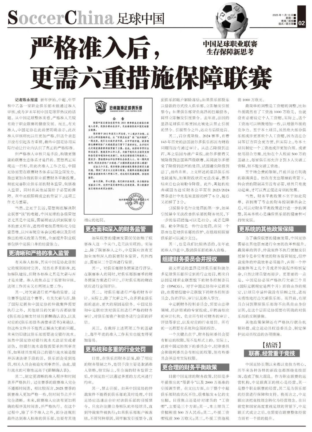 其二,制定更清晰的准入程序和時間表並嚴格執行。過往賽季的聯賽准入完全不遵循時間表,相比較而言,2025賽季的聯賽准入更加嚴格一些,但時間節點並不完全清晰。未來,聯賽准入應該有更加明確的程序及時間表,並嚴格執行。在這個過程中,除了不予准入之外,部分違規但最終達到准入標準的俱樂部,也要有其他相應的處罰。