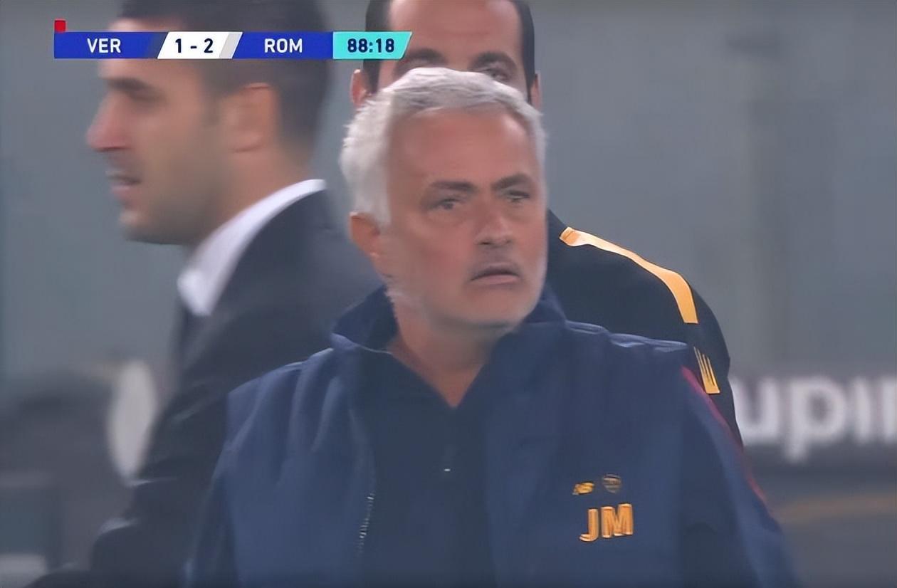 第19分鐘,亞伯拉罕單刀晃過門將後打空門擊中立柱,鏡頭立刻給到了替補席上的穆里尼奧。
