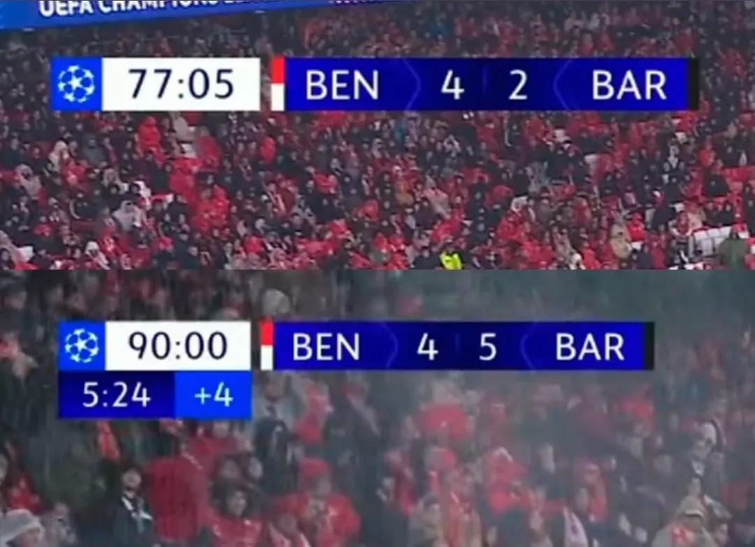 下半場弗裏克換上德容和費爾明希望改變局面,第64分鐘此前表現不錯的本菲卡門將特魯賓也犯下致命失誤:後場開球擊中拉菲尼亞頭部後皮球直接入網。但4分鐘後巴薩中衛阿勞霍解圍剷球自擺烏龍,巴薩2比4落後。第74分鐘弗裏克換上費蘭·託雷斯和中衛加西亞孤注一擲,巴薩最後18分鐘的超級大逆轉就此迎來真正的高潮。