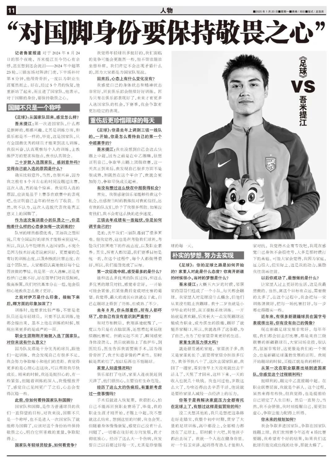 記者魯蜜報道 對於2024年8月24日的那個夜晚,吾米提江至今仍心有餘悸,甚至想到還會流淚——2024年中超第23輪,三鎮客場對陣津門虎,下半場補時第8分鐘,他顱骨骨折,一度以爲職業生涯戛然而止。好在,經過5個月的恢復,他重新站了起來,而且進了國家隊,他表示,對於國腳的身份,要保持敬畏之心。