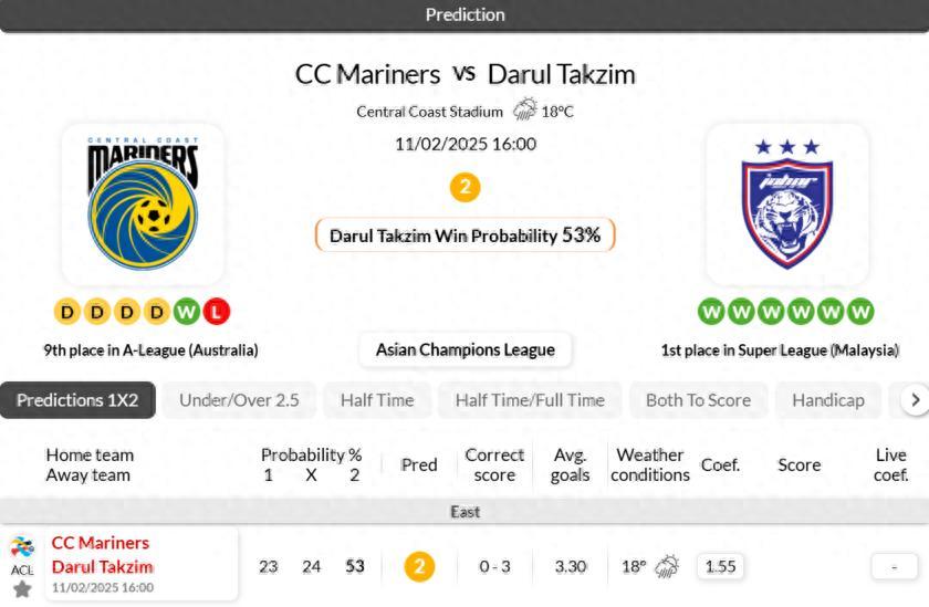 在中央海岸水手最近6場亞冠比賽中,總進球數均超過2.5球。