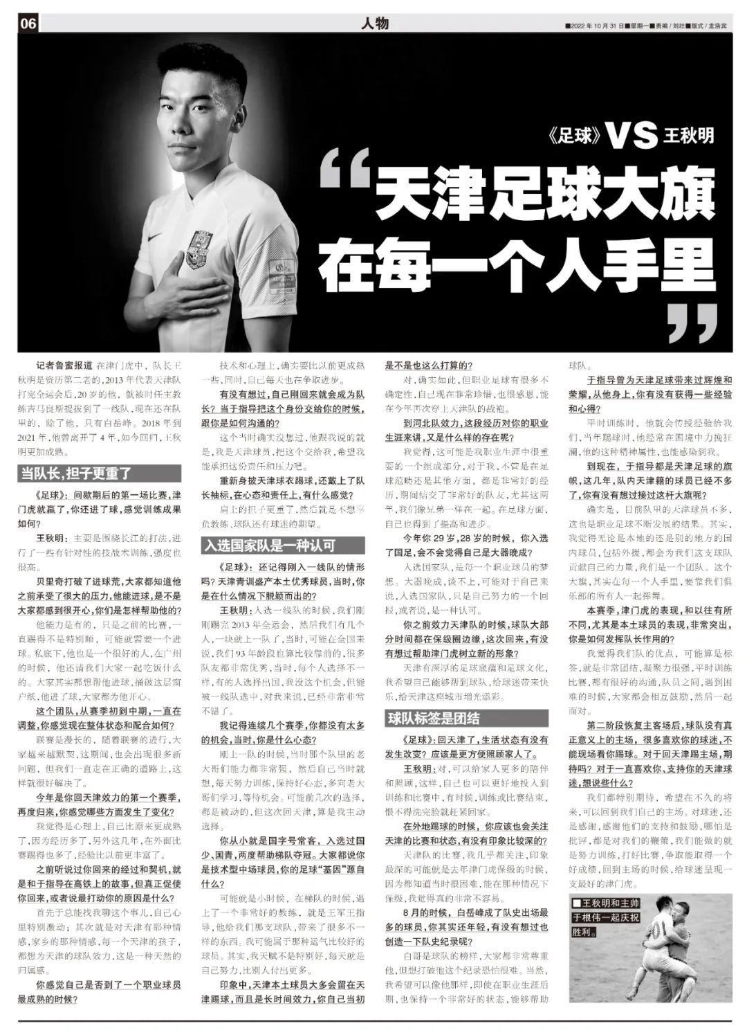 記者魯蜜報道 在津門虎中,隊長王秋明是資歷第二老的,2013年代表天津隊打完全運會後,20歲的他,就被時任主教練吉馬良斯提拔到了一線隊,現在還在隊裏的,除了他,只有白嶽峯。2018年到2021年,他曾離開了4年,如今迴歸,王秋明更加成熟。