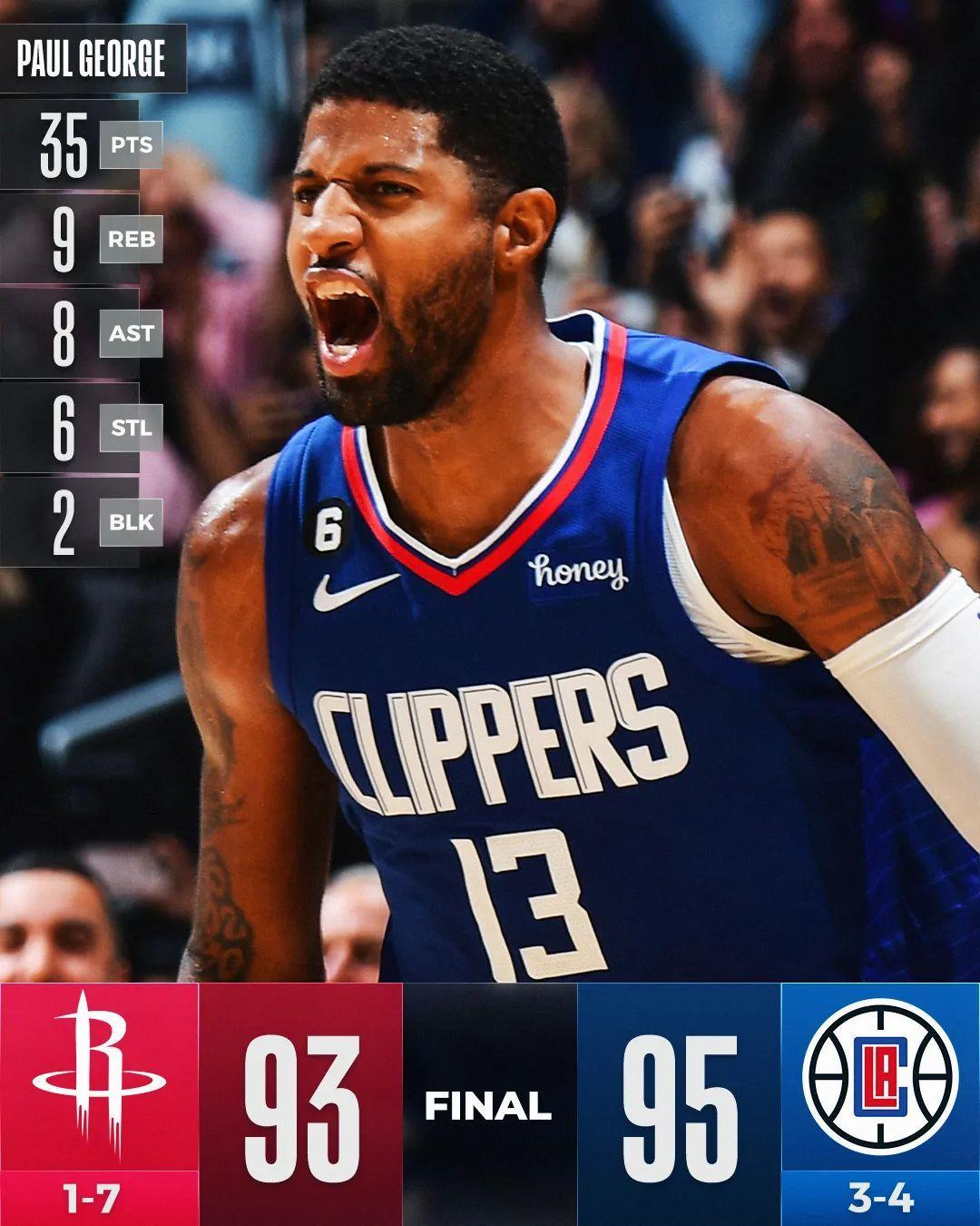 火箭最後一攻不中,喬治完成準絕殺,幫助快艇主場95比93驚險取勝,終結四連敗!