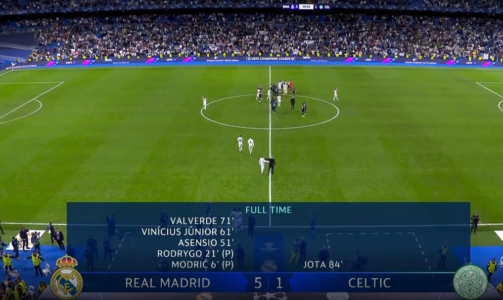 莫德里奇、羅德里戈、阿森西奧、維尼修斯和巴爾韋德各進一球,皇馬主場5-1大勝凱爾特人。最終,皇馬以1分優勢力壓萊比錫,以小組第一的身份出線。