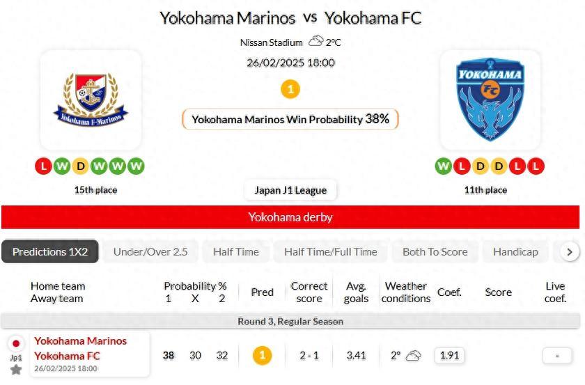 橫濱水手在最近4場J1聯賽主場對陣橫濱FC的比賽中,均以3球或以上的優勢獲勝。
