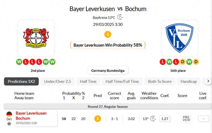 勒沃庫森在最近4場主場對陣波鴻的比賽中都取得了勝利