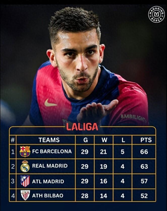 領頭羊巴塞羅那在主場4-1輕取赫羅納後,不僅以66分繼續領跑積分榜,更創造了本賽季西甲首支9連勝球隊的紀錄。這支進攻火力驚人的球隊,29輪聯賽狂轟82球,這一數據冠絕五大聯賽。自2025年以來,巴薩在各項賽事20場比賽中保持17勝3平的不敗戰績,全賽季45場比賽已打入139球,距離隊史單賽季進球紀錄僅差2球。如此恐怖的狀態,讓加泰羅尼亞球隊成爲奪冠最大熱門。