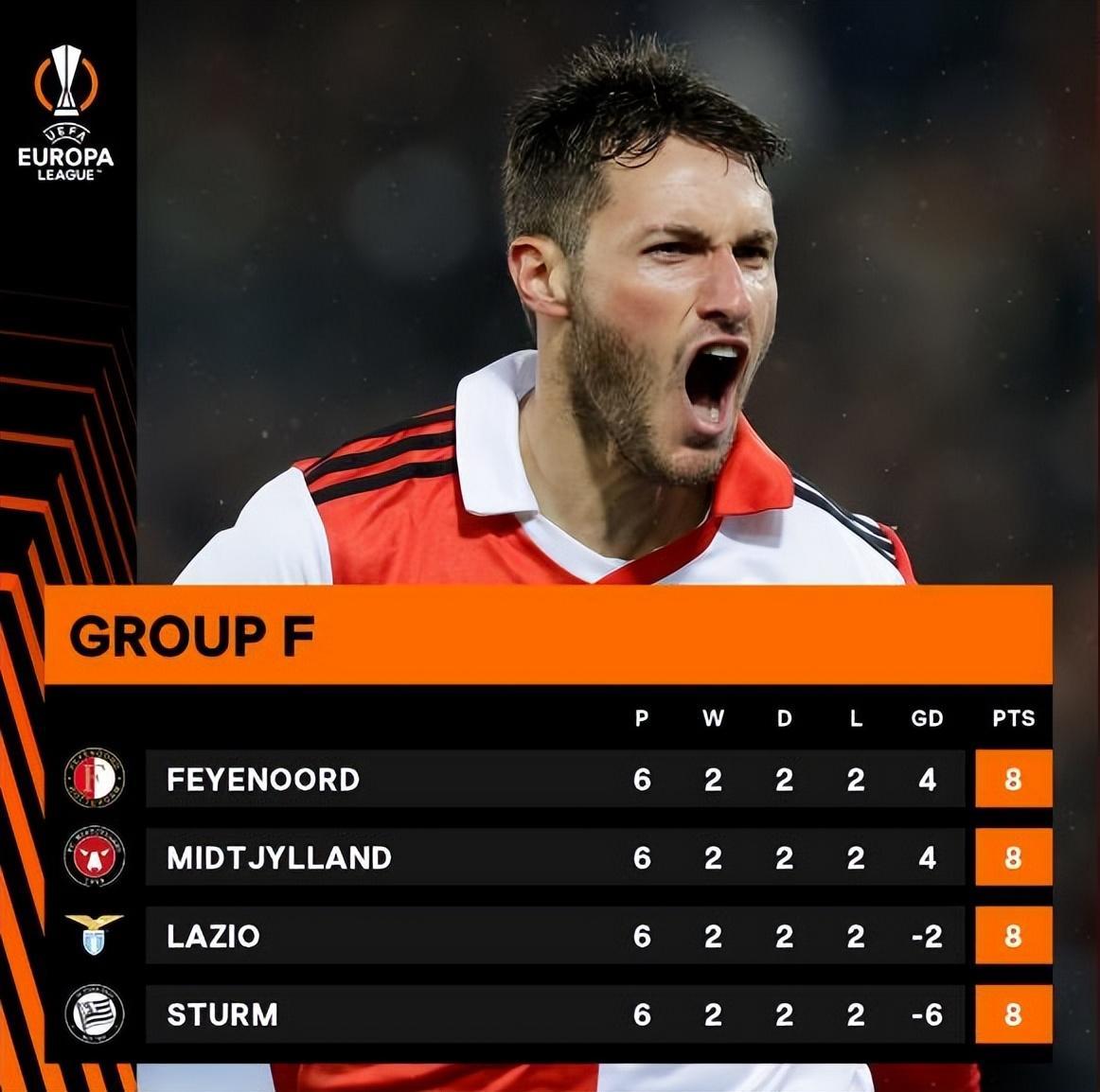 在歐聯杯5輪過後,原本拉齊奧和格拉茨風暴以8分位列F組第一和第二,而費耶諾德和中日德蘭則是以5分排名第三和第四。