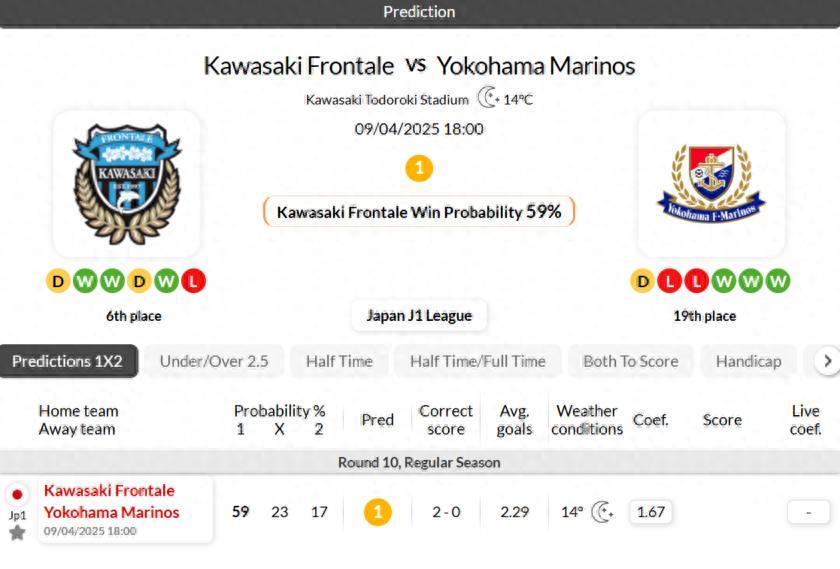 - Kawasaki Frontale have been conceding 0.33 goals on average in their home games (J1 League).