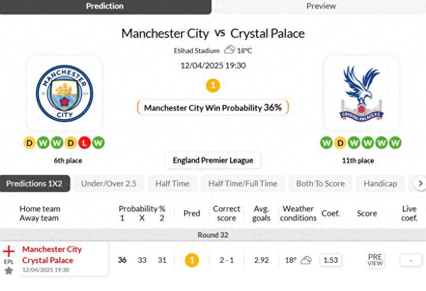 曼城在最近6場英超對陣水晶宮的比賽中保持不敗。