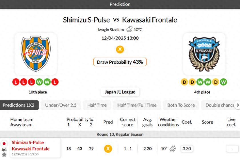 川崎前鋒在最近13次對陣清水心跳的日職聯比賽中保持不敗。
