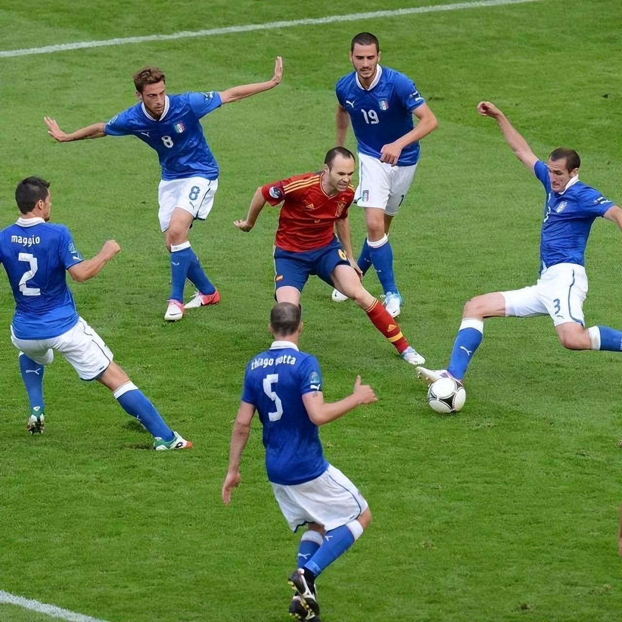 10年前的2012歐洲盃,西班牙對陣意大利的比賽留下了一張經典照片。伊涅斯塔被意大利隊5名球員包圍,他們都是效力於豪門的名將——基耶利尼、博努奇、馬喬、馬爾基西奧、莫塔。