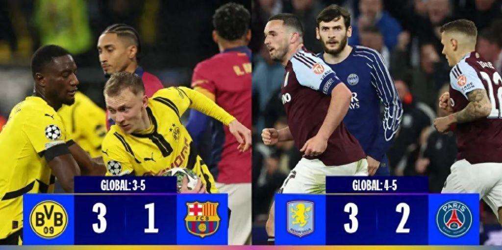 記者寒冰報道 歐冠1/4決賽次回合,儘管晉級希望渺茫,阿斯頓維拉和多特蒙德還是在主場打出了令球迷滿意的表現。阿斯頓維拉在27分鐘就0比2落後不利局面下連追3球,險些將比賽拖入加時賽,最終總比分4比5抱憾出局;多特蒙德依靠吉拉西的帽子戲法3比1終結巴薩24場不敗,遺憾首回合0比4天坑難填。大巴黎和巴薩有驚無險出線,而主場各攻入3球取勝的維拉和多特蒙德足以昂首出局。