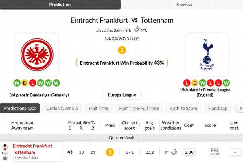 法蘭克福在最近11場歐聯杯比賽中,有9場保持不敗。