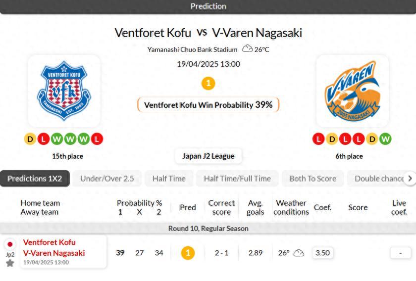 - Ventforet Kofu are undefeated in 5 of their last 6 home games against V-Varen Nagasaki in J2 League.
