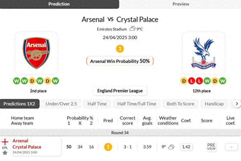 在最近6場對陣水晶宮的所有比賽中,阿森納全部獲勝。