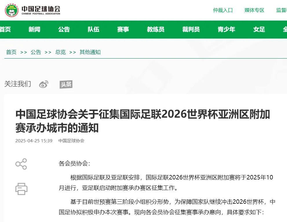 4月25日,中國足協發佈了《關於徵集國際足聯2026世界盃亞洲區附加賽承辦城市的通知》,即18強賽的各小組三、四名晉級附加賽。值得注意的是,在18強賽結束後,亞足聯將在提交申辦意向並獲得2026世預賽附加賽資格的會員協會中確定最終承辦地。換而言之,中國足協是預申辦,只有國足晉級10月附加賽纔可以獲得申辦資格。正如本報之前提到過,此次預申辦,既是既定的流程,又是對6月兩場“決戰”的激勵。
