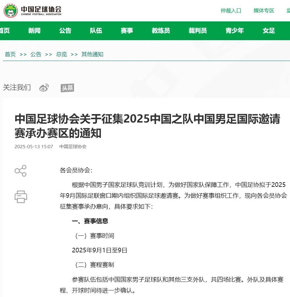 而在5月13日,中國足協發佈《關於徵集2025中國之隊中國男足國際邀請賽承辦賽區的通知》,計劃在9月1日到9日期間舉行四國賽,參賽隊伍包括中國國家男子足球隊和其他三支外隊,共四場比賽,即兩兩對陣之後再進行一二名和三四名決賽,而非傳統四國賽的單循環賽賽制,這也符合國家隊在一個國際足聯比賽日進行兩場比賽的慣例。外隊及具體賽程、開球時間待進一步確認。很顯然,9月舉行國足四國賽,並非一次簡單的熱身賽事。