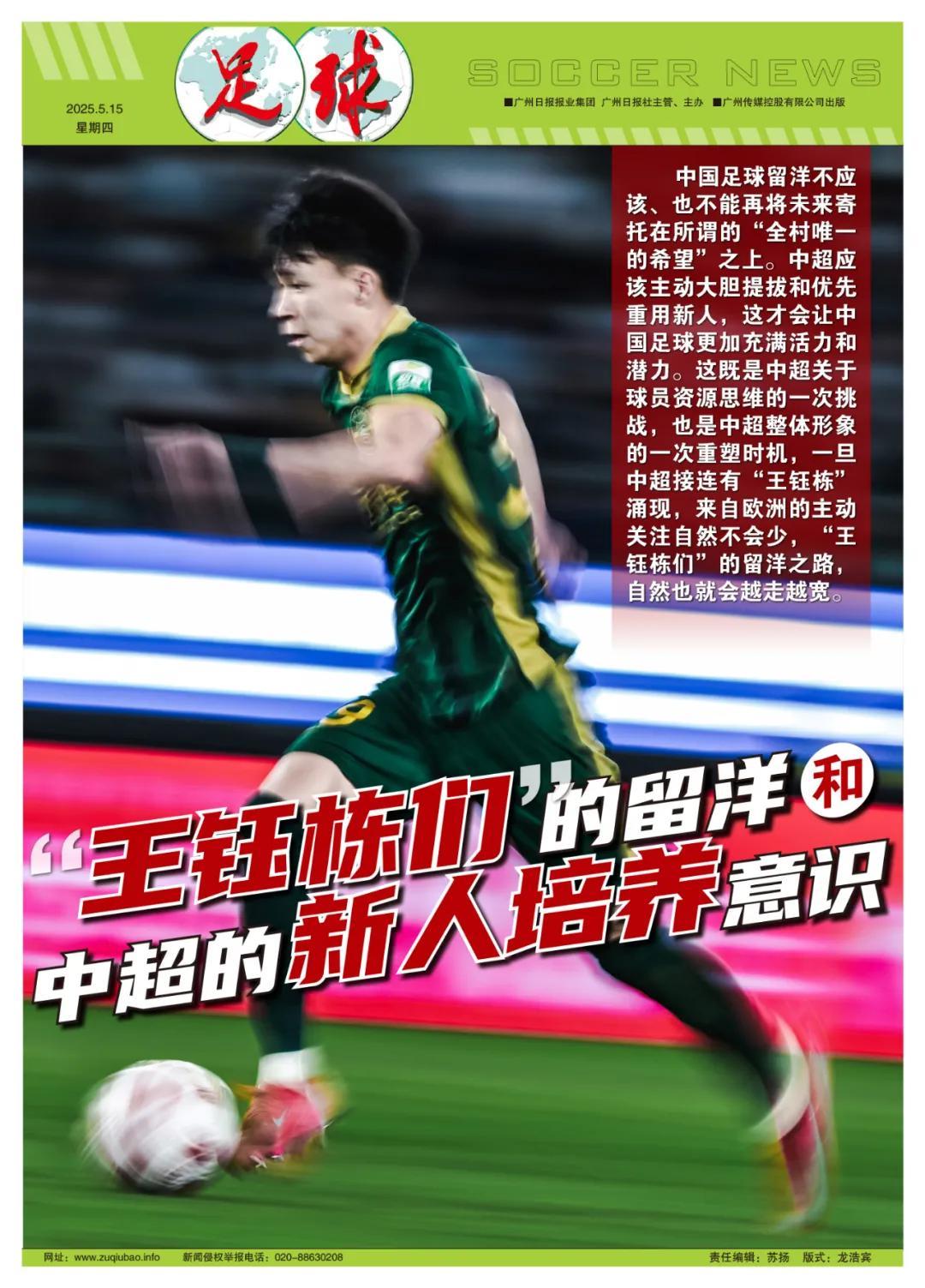 中國足球留洋不應該、也不能再將未來寄託在所謂的“全村唯一的希望”之上。而是要立足於首先讓新人們在中超聯賽打好基礎,得到足夠多的表現機會和成長時間。這需要更多中超俱樂部改變既有思維模式,像本賽季浙江綠城、青島西海岸、上海申花、成都蓉城,大連英博等俱樂部一樣,主動大膽提拔和重用新人,這纔會讓中超更加充滿活力和潛力。這既是中超關於球員資源思維的一次挑戰,也將是中超整體形象的一次重塑時機,一旦中超接連有“王鈺棟”湧現,來自歐洲的主動關注自然不會少,“王鈺棟們”的留洋之路,自然也就會越走越寬。