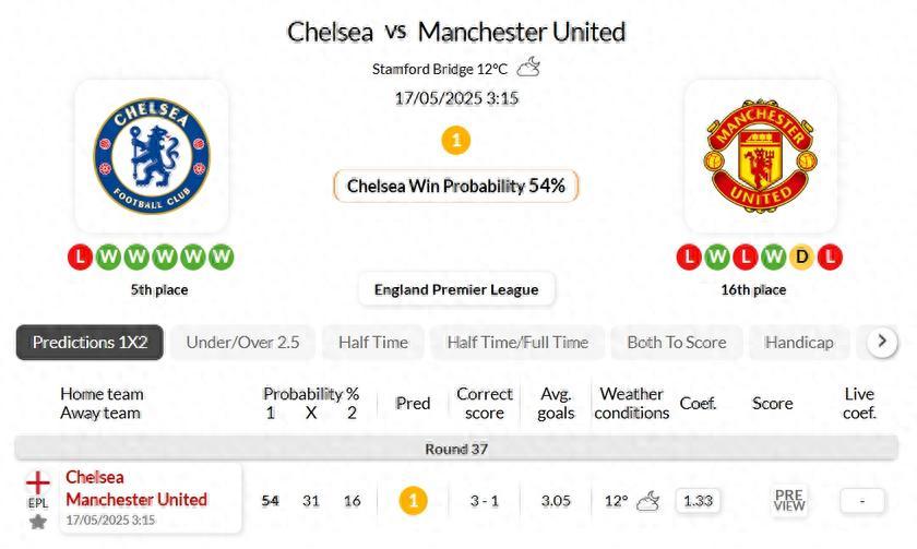 "Chelsea have lost only three of their last twelve home fixtures against Manchester United."
