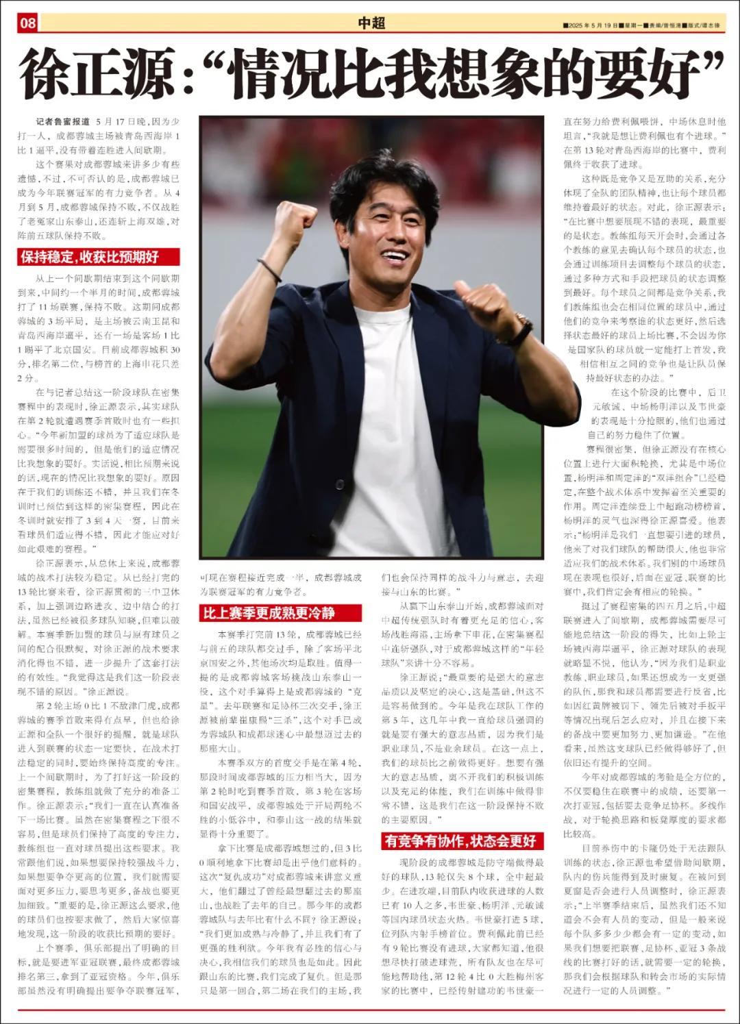 徐正源表示,從總體上來說,成都蓉城的戰術打法較爲穩定。從已經打完的13輪比賽來看,徐正源貫徹的三中衛體系,加上強調邊路進攻、邊中結合的打法,雖然已經被很多球隊知曉,但難以破解。本賽季新加盟的球員與原有球員之間的配合很默契,對徐正源的戰術要求消化得也不錯,進一步提升了這套打法的有效性。“我覺得這是我們這一階段表現不錯的原因。”徐正源說。