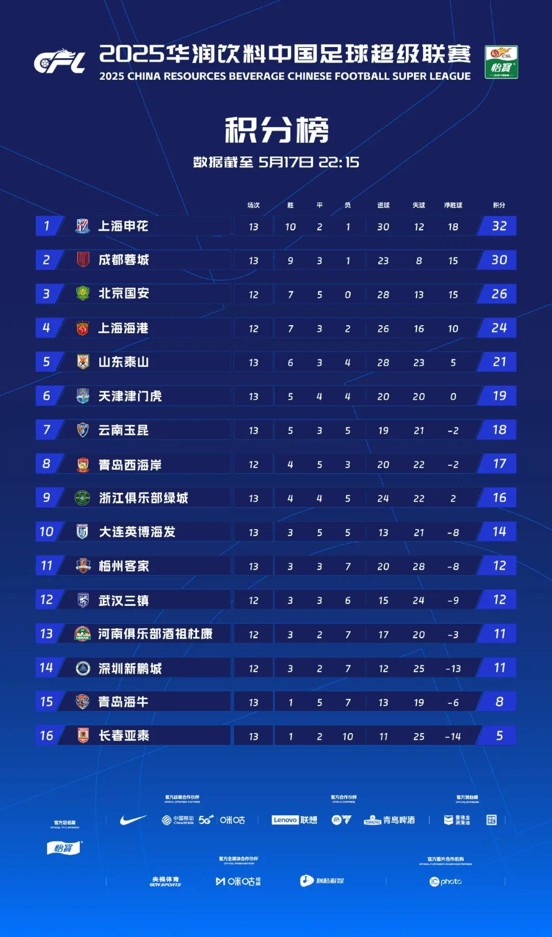 從上一個間歇期結束到這個間歇期到來,中間約一個半月的時間,成都蓉城打了11場聯賽,保持不敗。這期間成都蓉城的3場平局,是主場被雲南玉昆和青島西海岸逼平,還有一場是客場1比1踢平了北京國安。目前成都蓉城積30分,排名第二位,與榜首的上海申花只差2分。