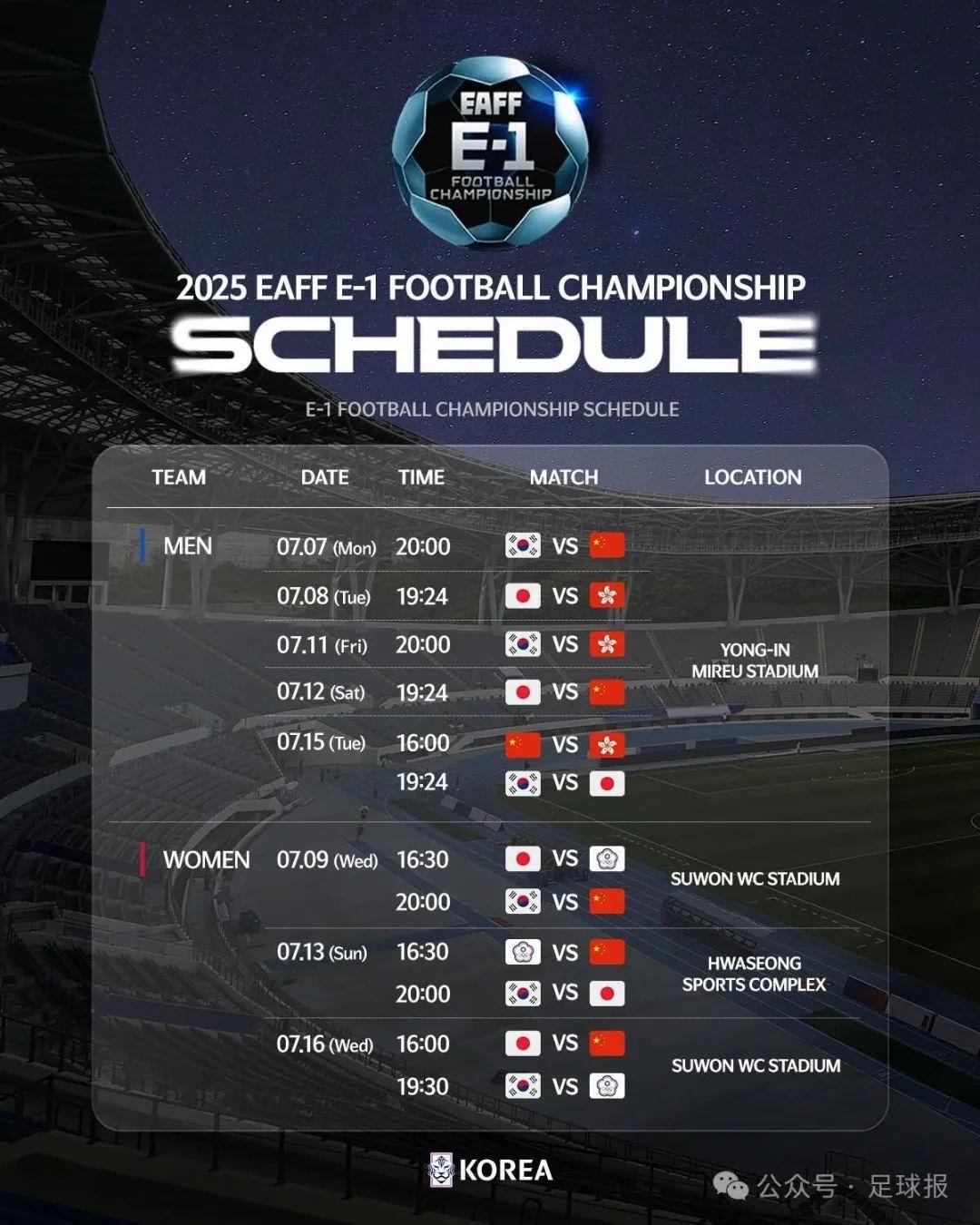 此次東亞杯的國足具體賽程(北京時間)是:7月7日19:00,韓國男足VS中國男足;7月12日18:24,日本男足VS中國男足;7月15日15:00,中國男足 vs 中國香港男足。三場比賽均在龍仁龍體育場進行。