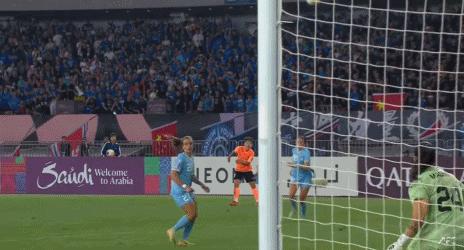 比賽在常規時間補時階段進入第一個高潮,墨爾本城第92分鐘通過反擊由亨利打入一球,但由於此前她對趙雨欣犯規在先被判無效。第96分鐘,鄧夢曄禁區內頭球攻門造成施普里克邁爾手球犯規,小泉朝香在武漢球員的提醒之下觀看VAR並判罰了點球,王霜主罰點球一蹴而就將比分扳平,雙方1比1進入加時賽。